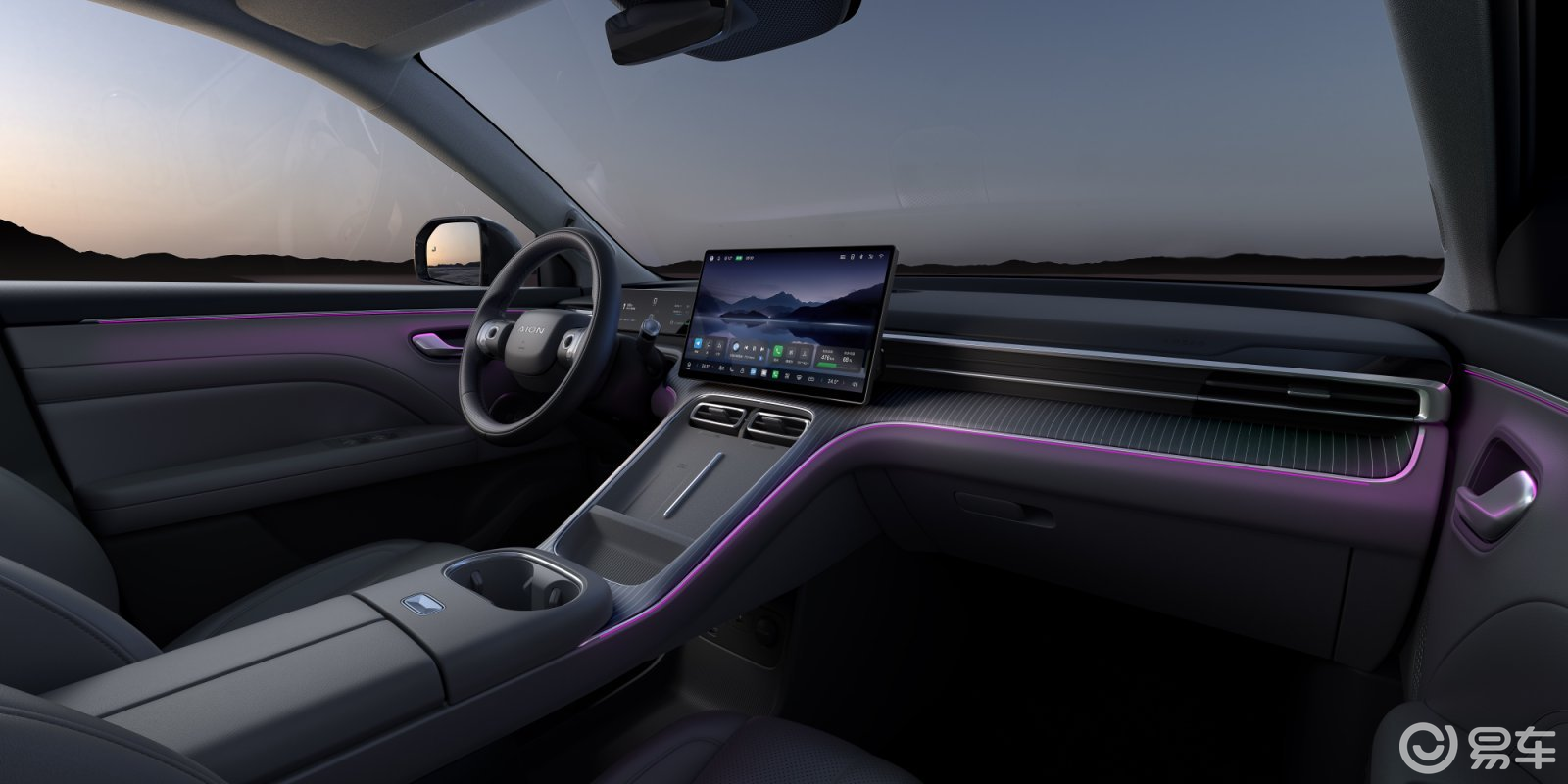 进入到车内,AION i60的内饰设计同样没有太特殊的设计细节,简洁的中控台以悬浮式液晶屏作为视觉重心。在这一基础上,中控台和中央马鞍座区域通过不同面料进行分区,凸显立体感。而在用料层面,AION i60在座舱四周也采用了比较丰富的软性PU包裹,触感比较细腻,同样符合家用定位。